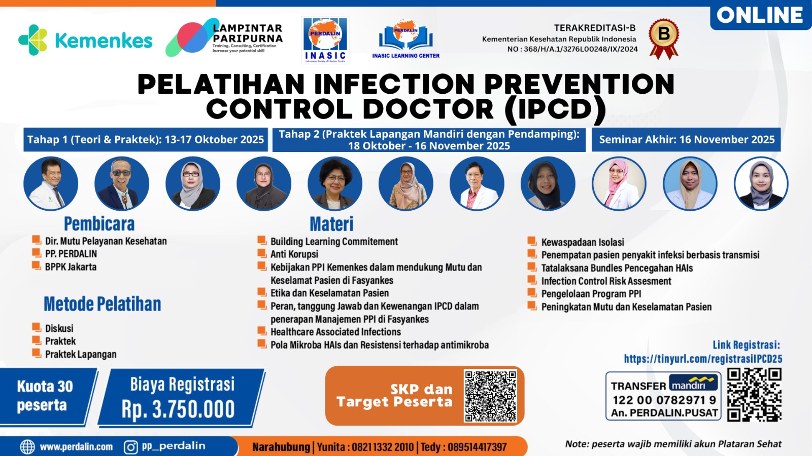 PERDALIN kembali membuka Pelatihan Infection Prevention Control Doctor (IPCD) Angkatan ke-2Tahap 1: