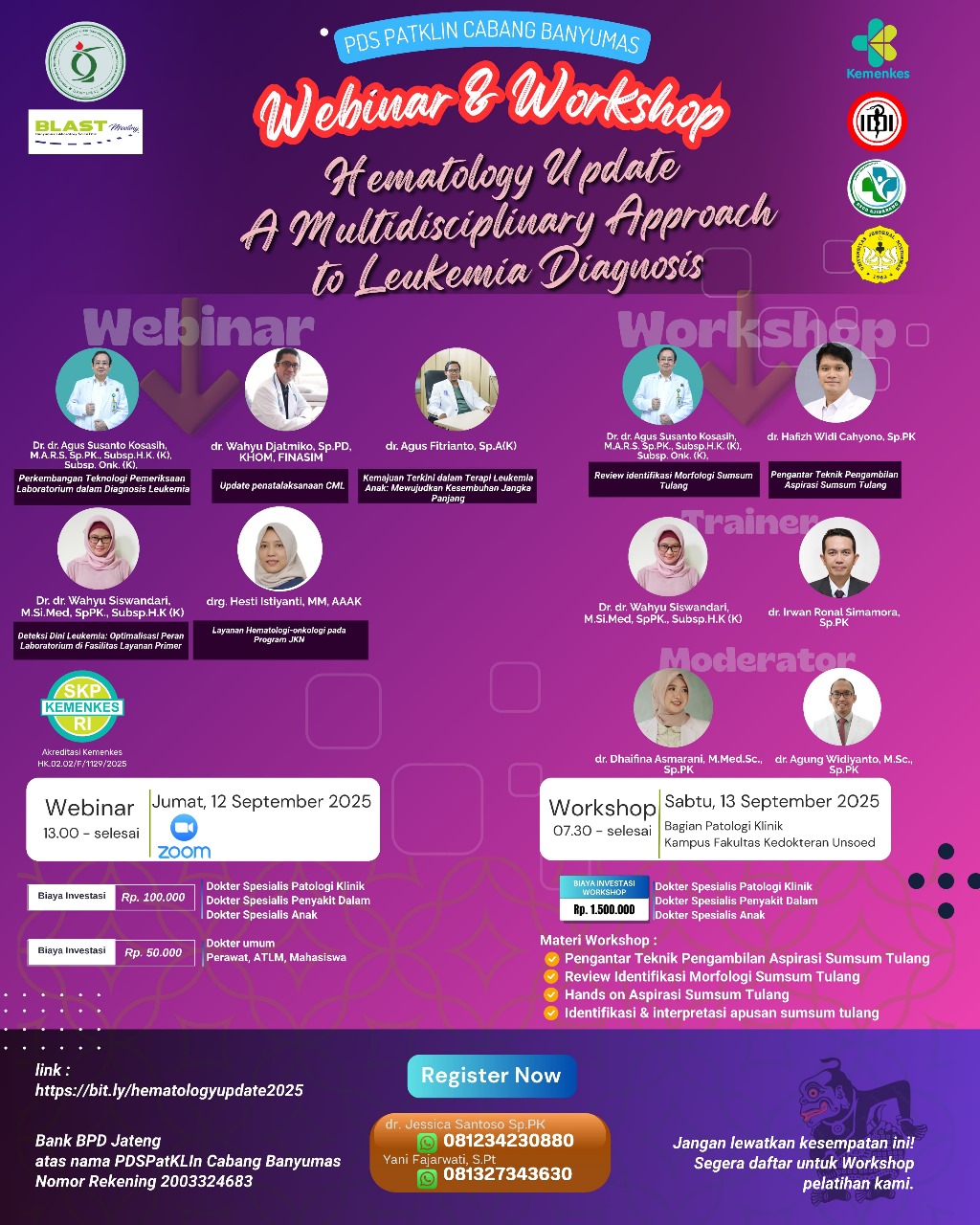 Perhimpunan Dokter Spesialis Patologi Klinik dan Kedokteran Laboratorium Indonesia (PDS PatKLIn) cabang Banyumas mengajak rekan sejawat untuk bergabung dalam acara Webinar dan Workshop “HEMATOLOGY UPDATE – A MULTIDISCIPLINARY APPROACH TO LEUKEMIA DIAGNOSIS” yang akan diselenggarakan pada :